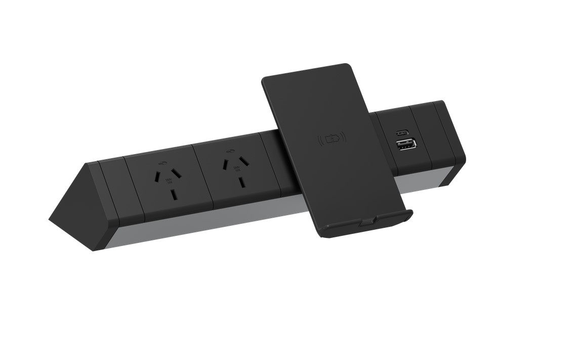FEATURES: - Auto power switched - Quick fit desk clamps - Gpo + Usb-A + Usb-C + Wireless - Compact, sleek and elegant design - Ideal for over the desk power option - Helistand 15W Integrated Wireless Charger - 30W shared fast charge module - Compatible with Inline USB Charging Modules - Anodised Aluminium body with Black or White end cap - Interconnecting lead 1000mm - Simple plug-and-play setup