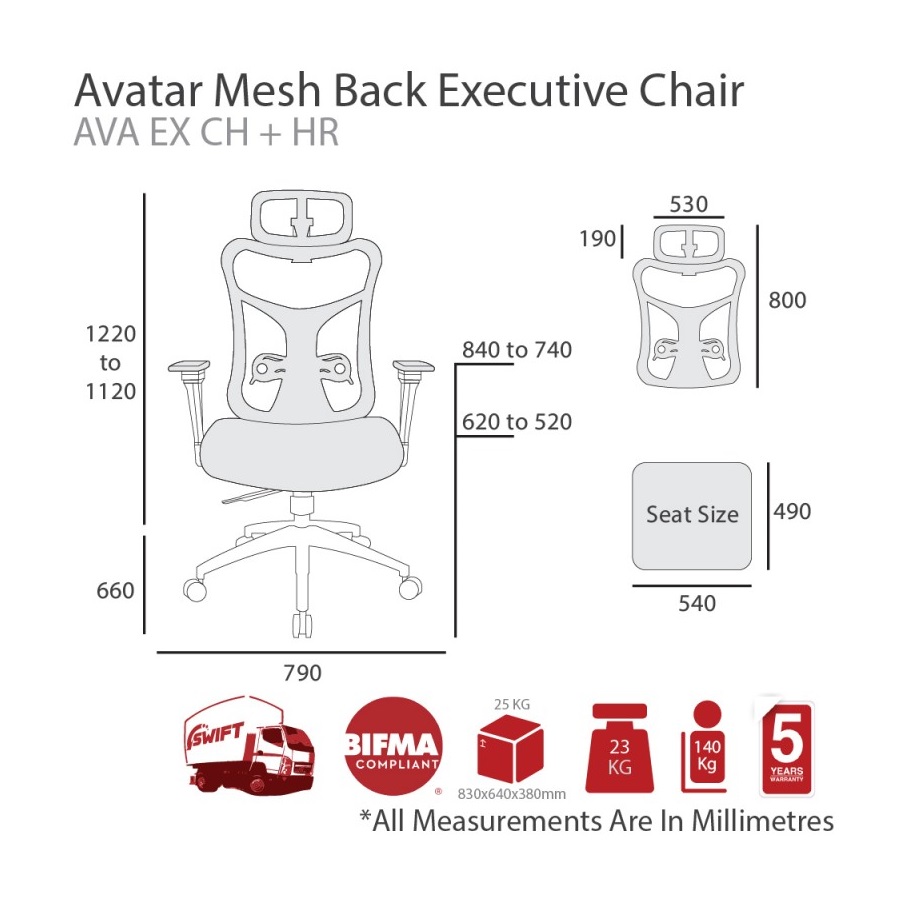 | Content | Avatar Executive Chair Seat: 540W x 490D x 520 - 620H Size: 790W x 660D x 1120 - 1220H