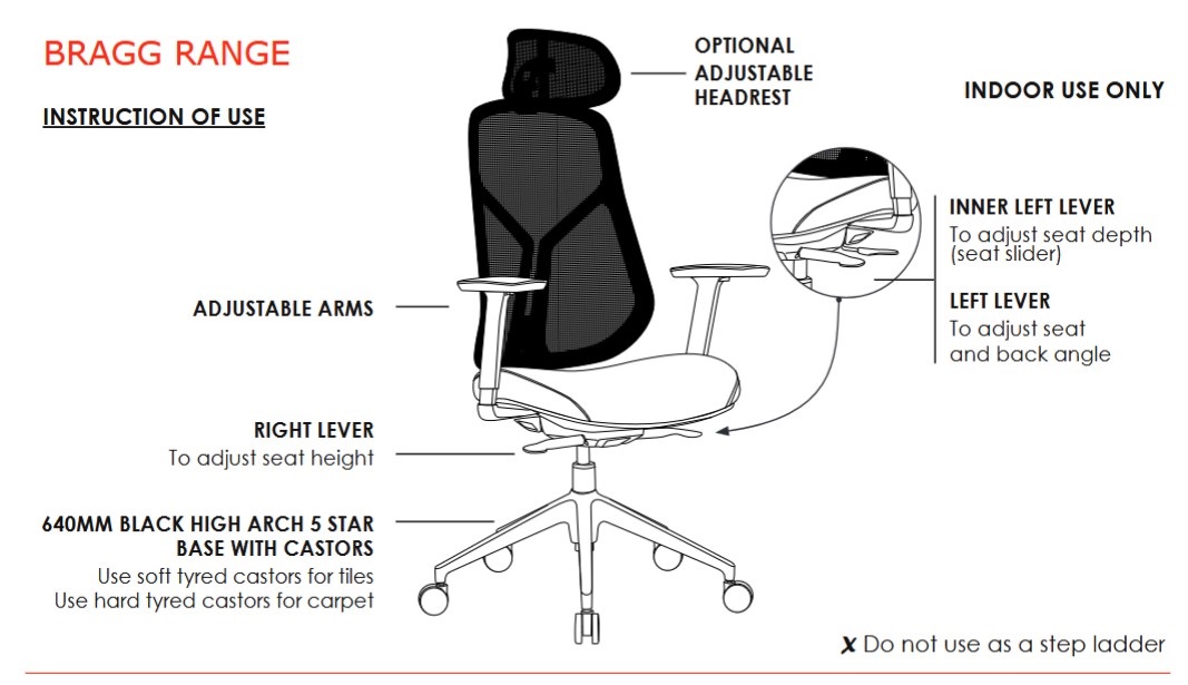| Content | Bragg Mesh Back Task Chair Seat: 510W x 510D x 490 - 570H Size: 640W x 640D x 1075 - 1150H