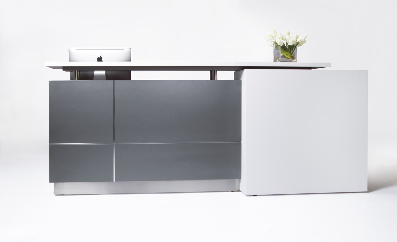 The Calvin Reception Counter features a sleek metallic grey design with a customizable feature panel.