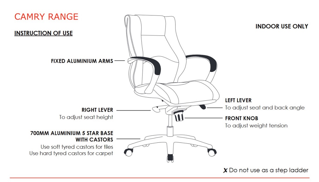 | Content | Camry Executive Chair Seat: 510W x 510D x 470 - 550H Size: 700W x 700D x 1190 - 1270H Impressive stylish and sturdy. This well-designed Camry chair is of the highest commercial quality. Perfect Managerial, or Director's Chair, complete with high-density foam offers the user maximum support and comfort. And this robust, durable chair will retain its shape and style for years to come.
