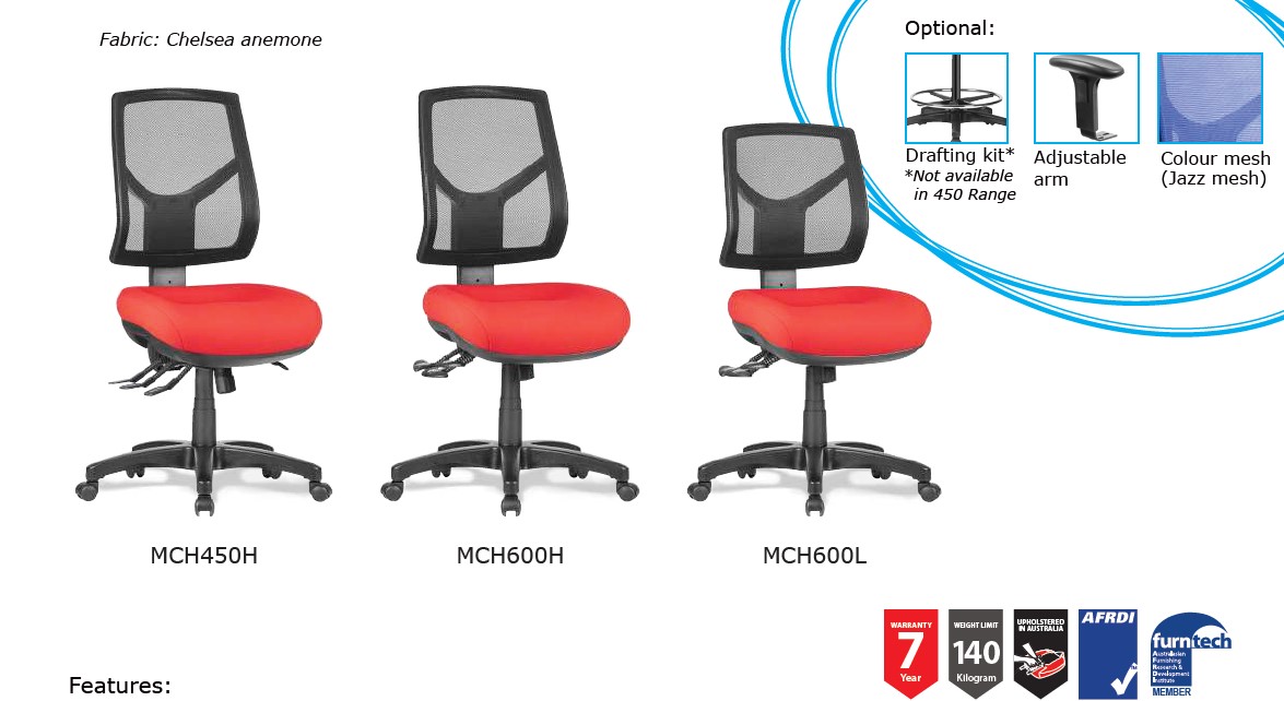 FEATURES: - Big boy seat - Moulded seat foam - Adjustable seat height - Adjustable weight tension - Black or colour mesh back - Adjustable seat and back angle - Adjustable back height (ratchet) - Optional seat depth (seat slider) - Available in high and low back - Optional adjustable arms - 700mm black nylon base - Available in local fabrics - AFRDI tested to level 6 - Weight limit is 140kg - 7 year warranty