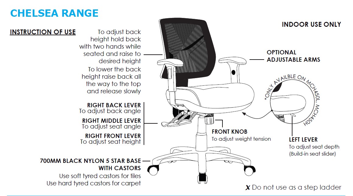 | Content | Chelsea Task Chair Seat: 510W x 480D x 525 - 605H