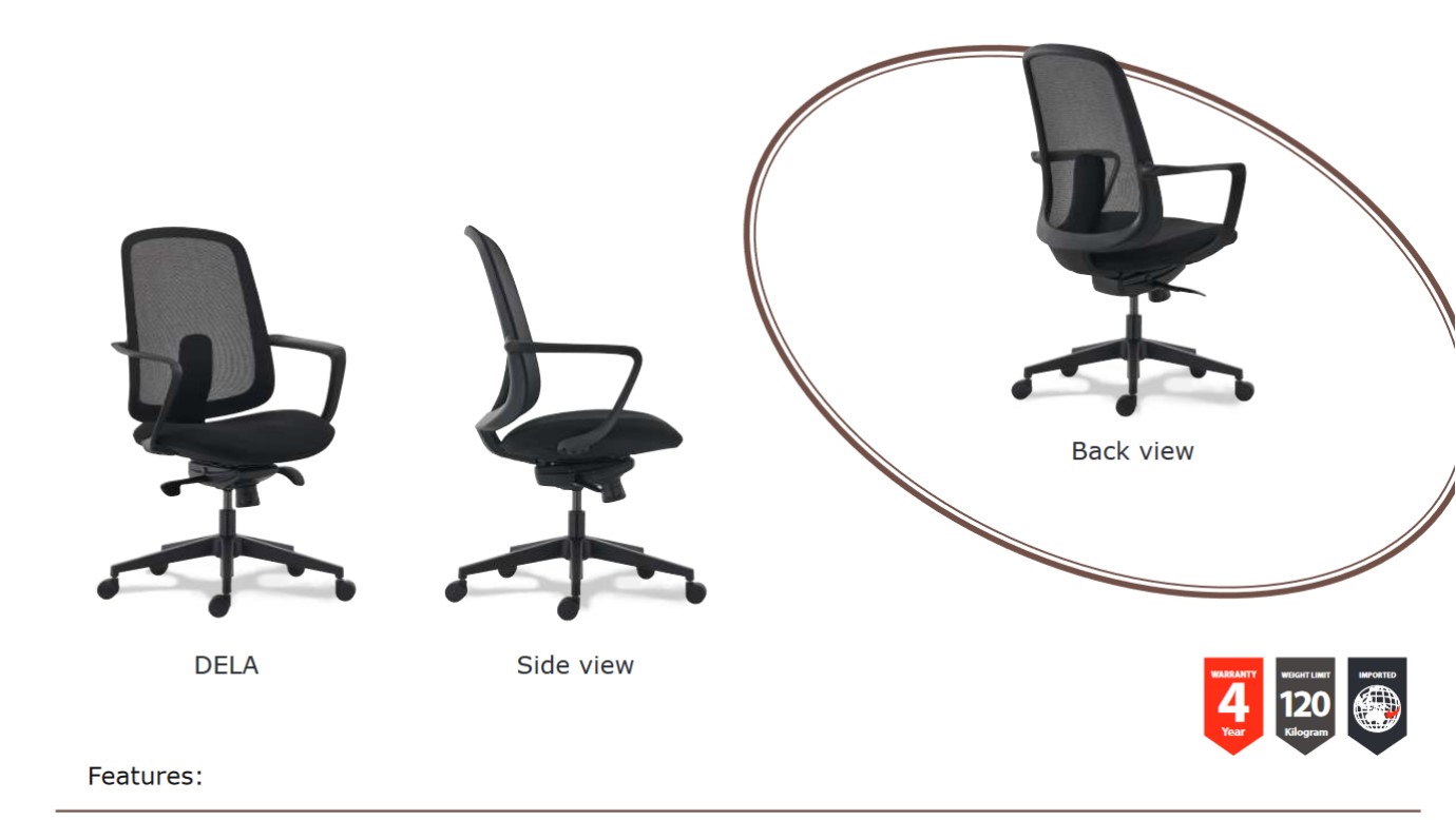 | Content | Dela Boardroom Chair Seat: 510W x 480D x 450 - 550H Size: 620W x 620D x 990 - 1090H A budget ergonomic chair with an adjustable seat angle, Dela is a good choice for a meeting chair. Comfortable seat and lumber support will provide you with long hours of sitting without any body pain.