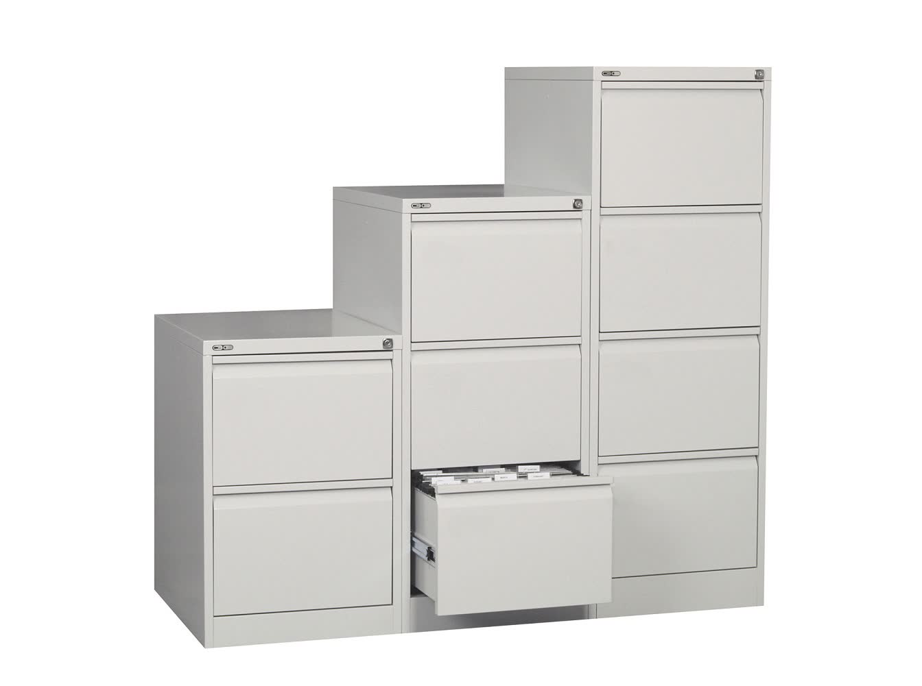 The Go filing cabinet range is built to last with a riveted construction, anti tilt locking and heavy duty ball bearing runners.