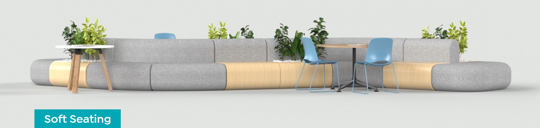 Elevate your office environment with Grove Sofa. Designed to blend contemporary aesthetics with practical functionality. Grove Sofa offers a modern, modular approach to commercial seating, fitting into any contemporary commercial space. Featuring soft curves and edges, it incorporates a design trend to create a visually appealing and inviting atmosphere. The system includes matching plywood modular tables and planters, adding natural wood accents to enhance any setting.
