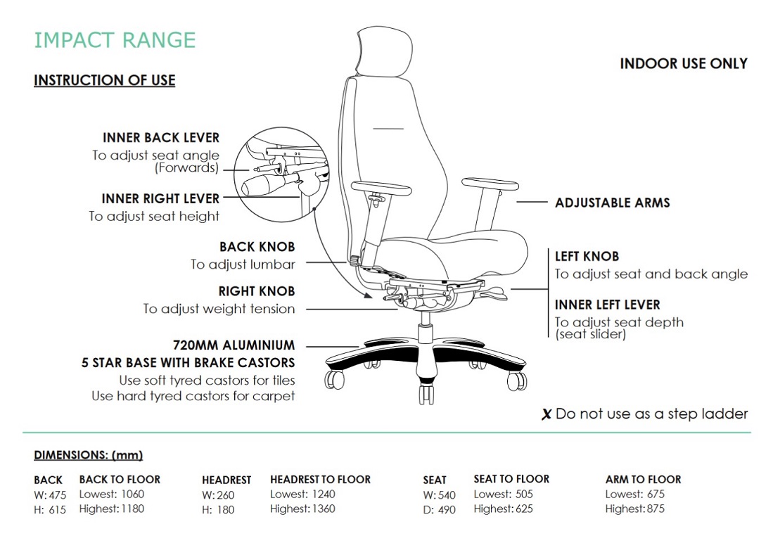| Content | Impact Heavy Duty Multi Shift Chair Seat: 540W x 490D x 495 - 585H Size: 700W x 700D x 1050 - 1140H