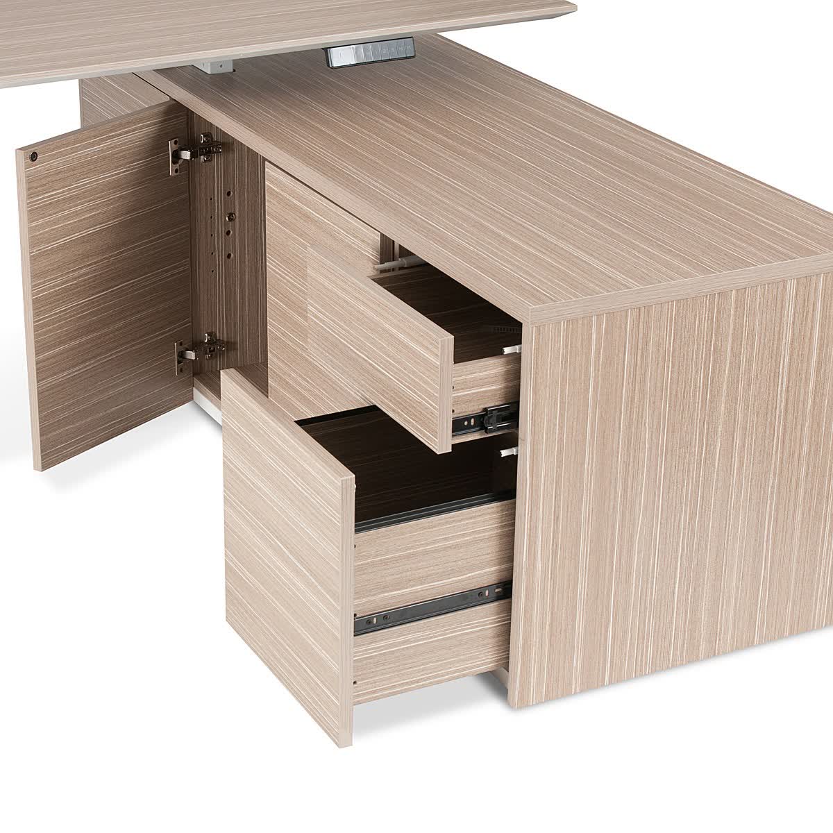 This Executive suite has a built-in dual-motor system, which will provide a seamless sit/stand function for years to come. This is the ergonomics of today's office furniture combined with an ultra-modern and cutting-edge design. This is a high-quality premium furniture set, and this Executive Suite is Sure to impress. Available as Left or Right Hand Side Return as Sitting behind the desk. All Finished in Tawny Linewood. Also Available in the Blackened Linewood.