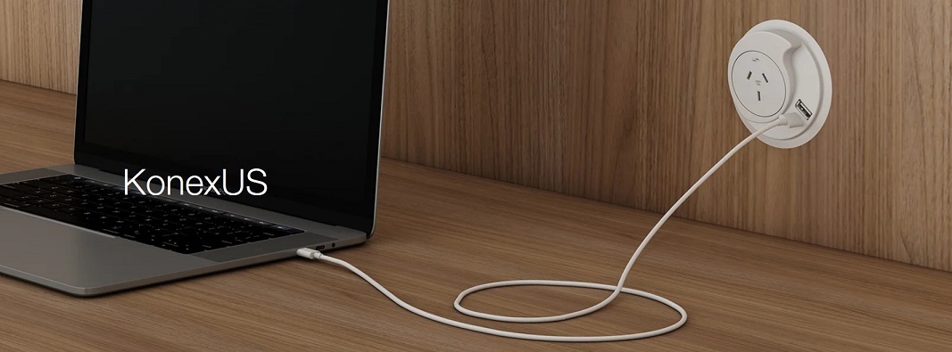 Fingertip access to power and charging technology KonexUS is a fit-out favourite offering auto-switched power with charging options like USB-C 100W PD fast-charging in a simple, ergonomic and easy-to-install module.