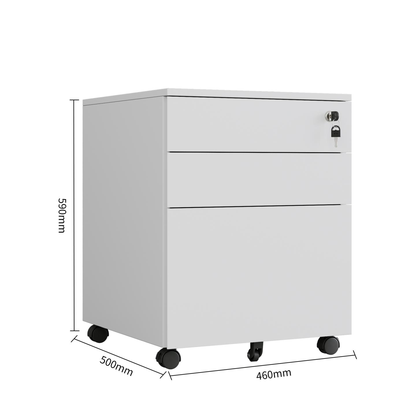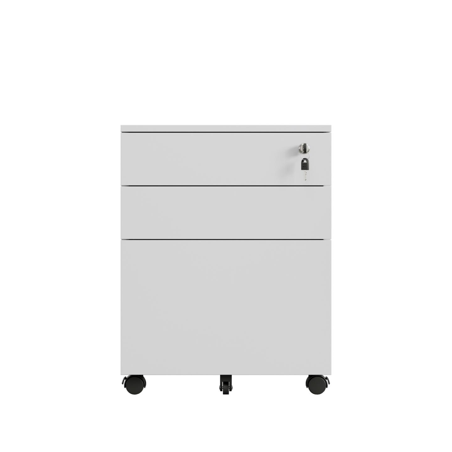 A convenient, durable and secure 3-drawer storage solution under or side of the desk.