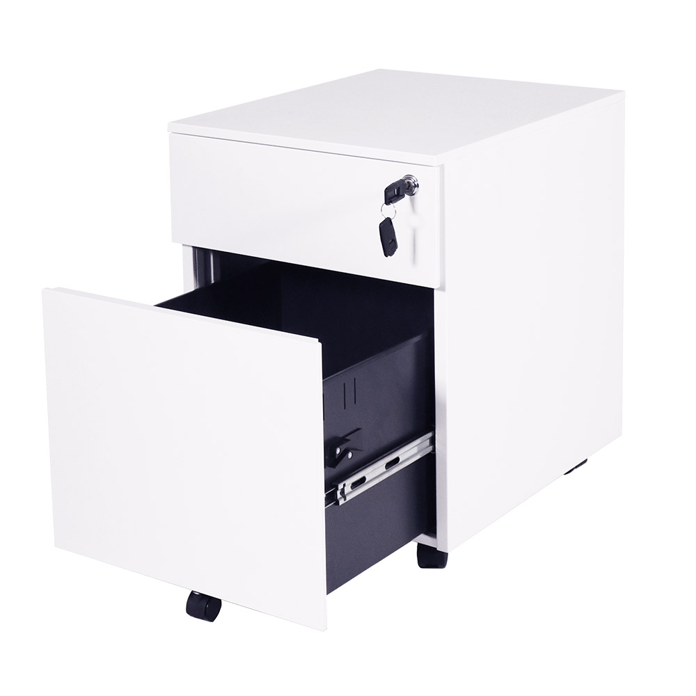 A convenient, durable and secure 2-drawer storage solution under the desk. This 2-Drawer Steel Pedestal is a low height mobile pedestal that is designed for use with height adjustable workstations. Includes 1 stationery drawer and 1 filing drawer with a multi-lock, and a fifth safety castor wheel.