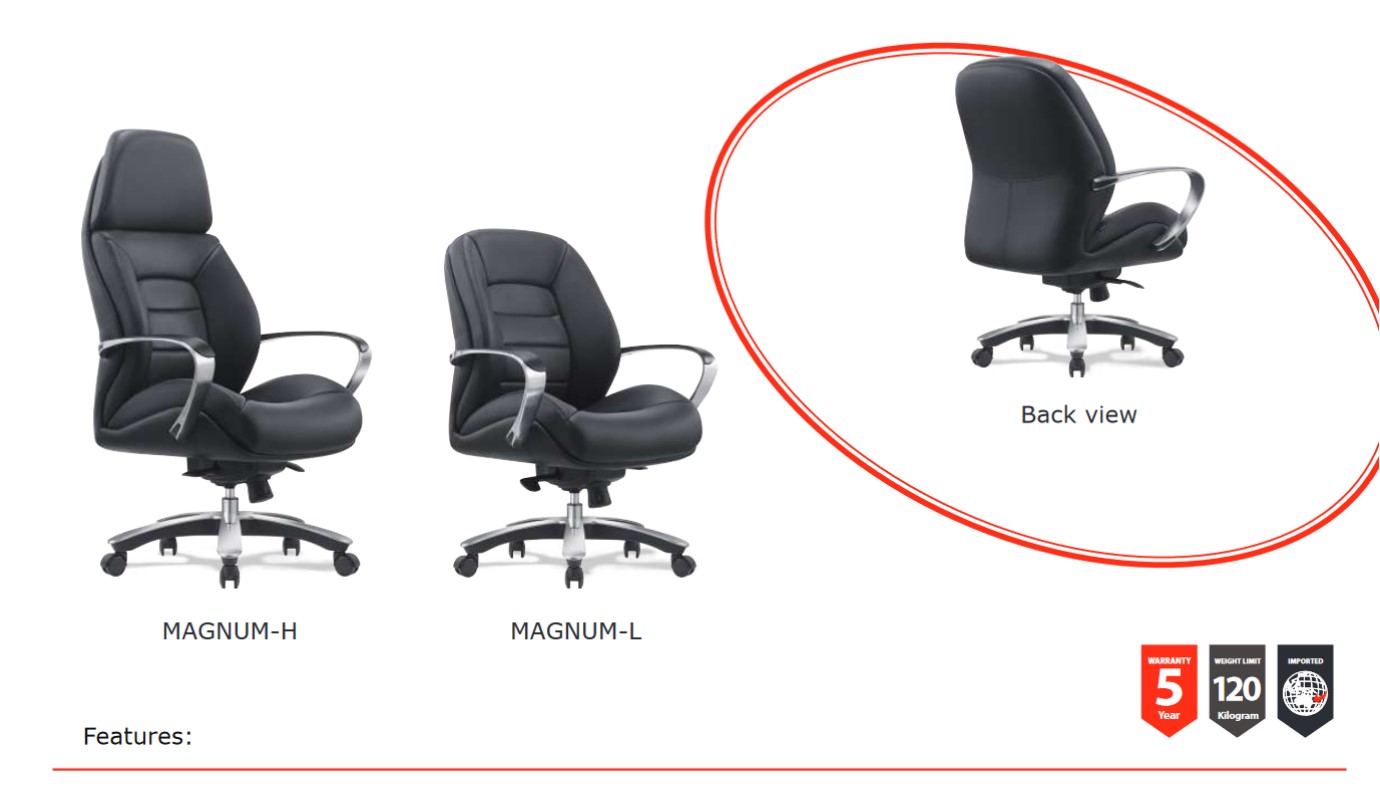 A Class Executive Chair. Eye-catching and impressive style. This chair is designed for heavy-duty use. Ergonomically designed for extra comfort. Featuring genuine leather, high-density foam and wide seat Well-padded for those long hours of sitting. A popular and impressive chair for the boss.