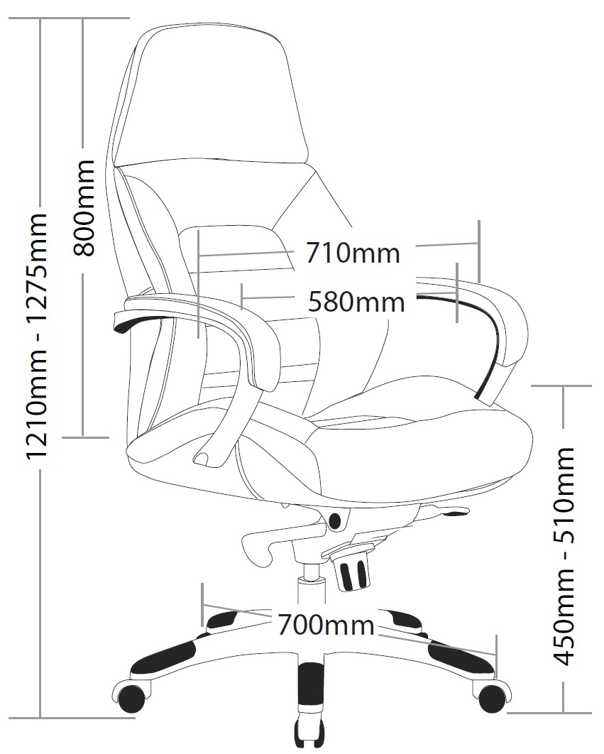 | Content | Magnum High Back Leather Executive Chair Seat: 550W x 500D x 450 - 510H Size: 700W x 700D x 1210 - 1275H