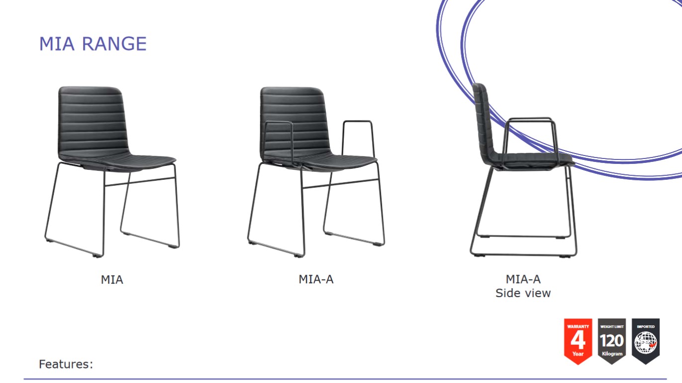 | Content | Mia Breakout Seating / Visitor Chair Seat: 480W x 440D x 485H Size: 585W x 550D x 855H Simple, contemporary, timeless design with assured quality. This chair will easily merge with any decor. A perfect Breakout and a visitor chair.