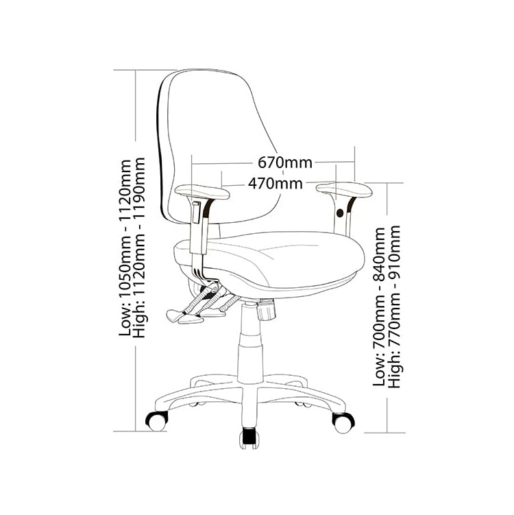 FEATURES: - Large Seat - Moulded seat foam - Adjustable seat height - Adjustable weight tension - Adjustable back & seat angle - Adjustable Ratchet back height - Adjustable seat and back angle - 3 Lever ergonomic mechanism - 700mm black nylon star base - Optional adjustable arms - AFRDI tested to level 6 - Weight limit is 140kg - 7 Year warranty