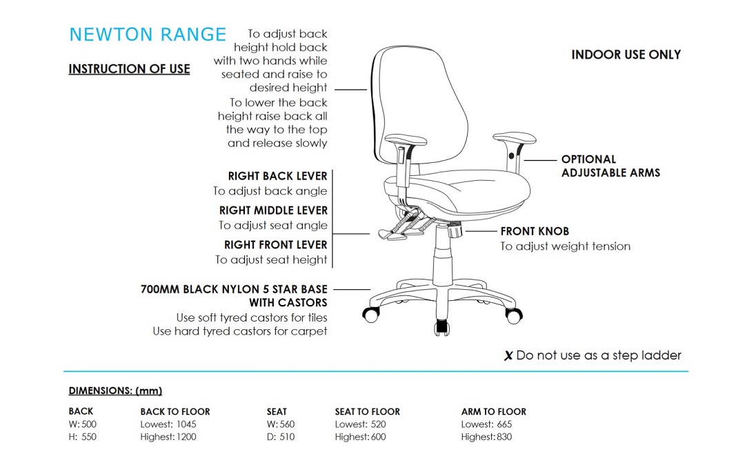 | Content | Newton Ergonomic Task Chair Seat: 560W x 510D x 530 - 670H Size: 700W x 700D x 1050 - 1120H