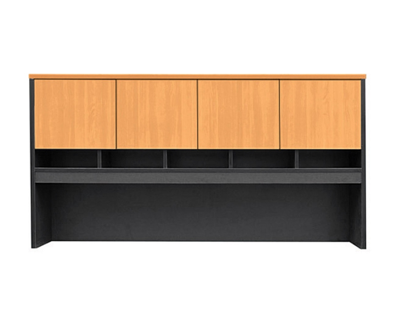This is a commercial-grade high quality hutch with pigeon holes. Made of E1 quality board with matching ABS edging throughout. This unit can be installed on any Credenza, workstation or desk with a return. A convenient overhead storage solution. Perfect for any office environment and built to last for years.