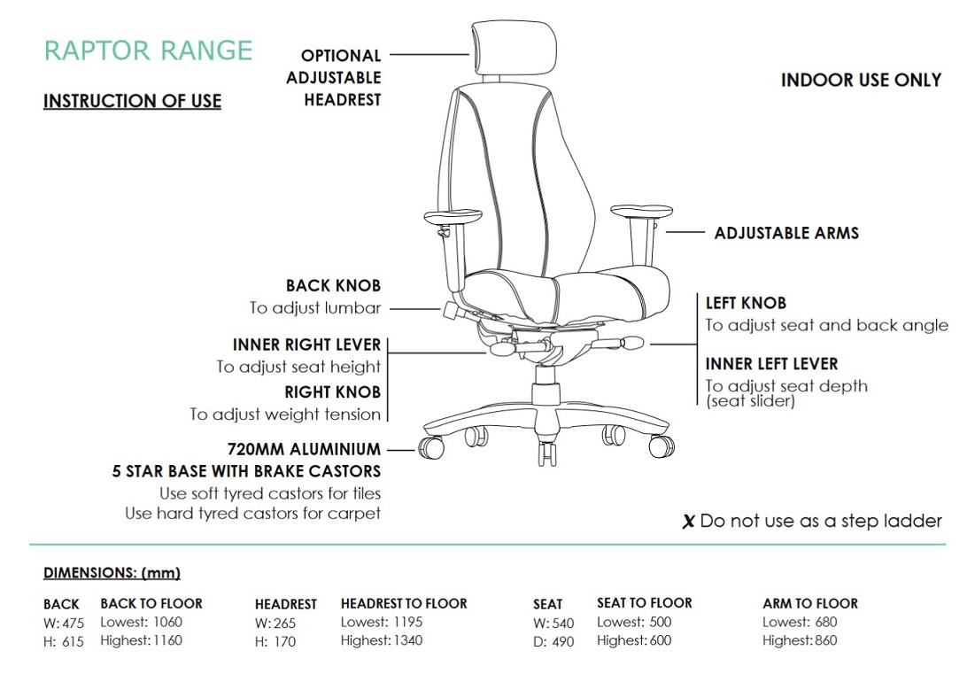 | Content | Raptor Heavy Duty Leather Chair Seat: 540W x 490D x 500 - 600H Size: 700W x 700D x 1240 - 1340H