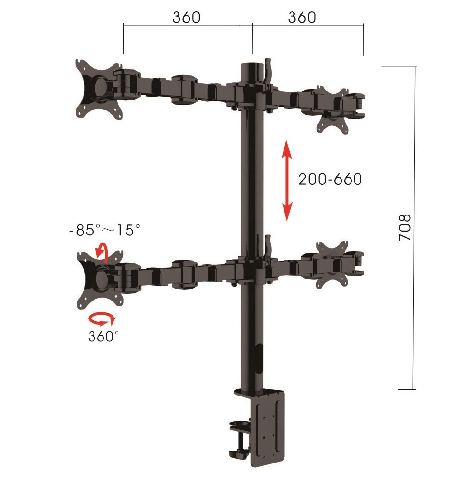 FEATURES: - Revolve Monitor arms - Suites 10 to 30 inch screens - 450 mm high central pole - 710mm high pole for Quad arms - Weight Capacity per Arm is 10kg - Built in 360 degree Rotation head - Vertical Tilt and Horizontal adjustment - Desk Edge Clamp Mount - need 40mm overhang - Effective cable management - Verticle height adjustment - Only in Black Colour - 3 Years warranty