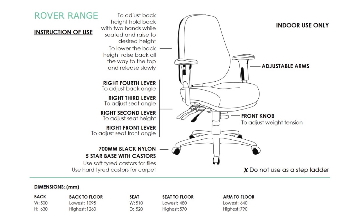 | Content | Rover Heavy Duty Leather Chair Seat: 510W x 520D x 480 - 570H Size: 700W x 700D x 1090 - 1260H