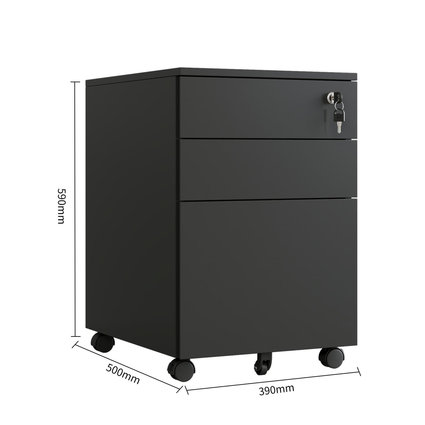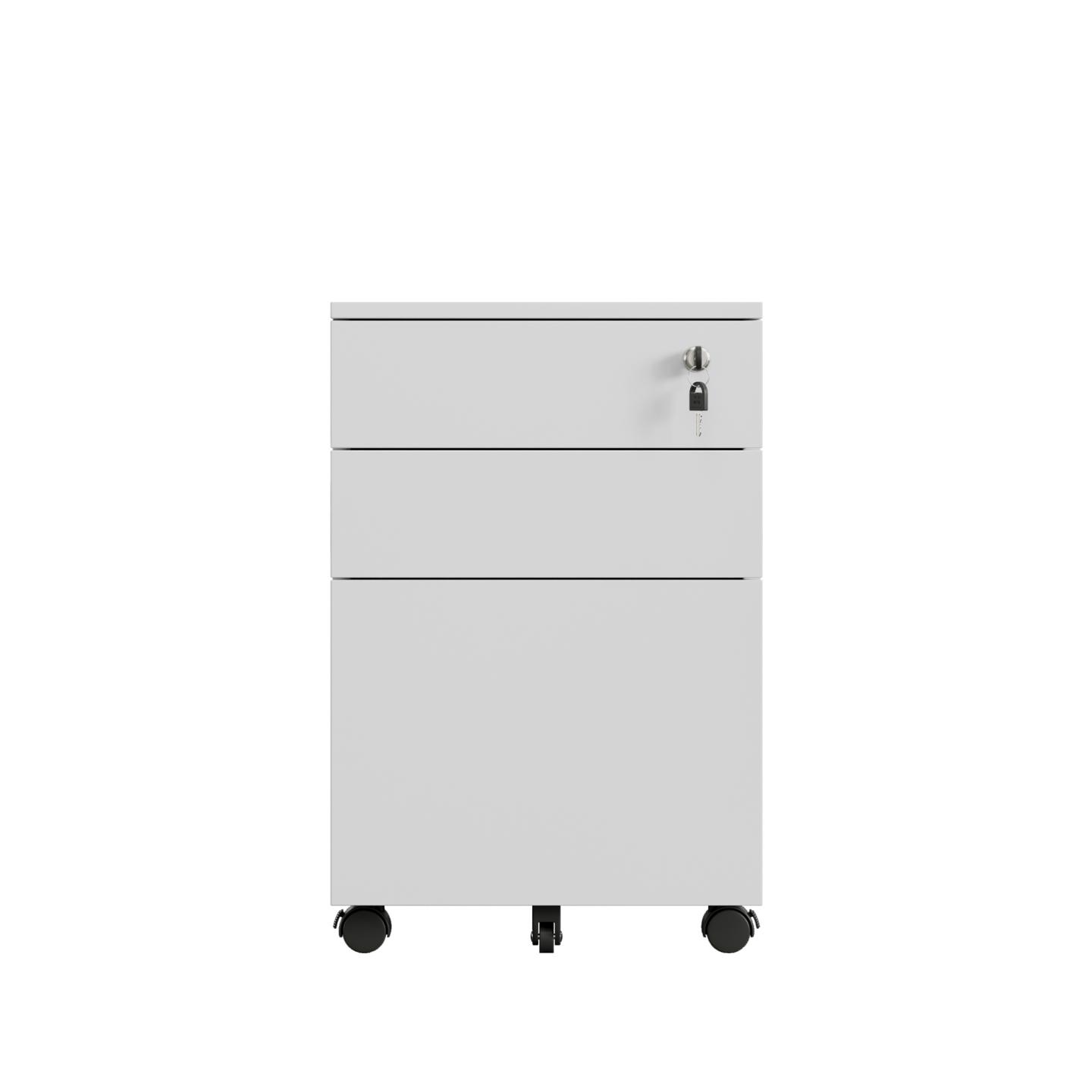 A convenient, durable and secure 3-drawer storage solution under the desk. Features include full steel construction in .8mm gauge steel, multi-lock, a fifth safety castor wheel. This unit has a steel ball bearing, double extension runners, a pen tray, and a foolproof gang locking system. Comes in 3 popular colours and is most suitable for any metal frame desk or office set up.