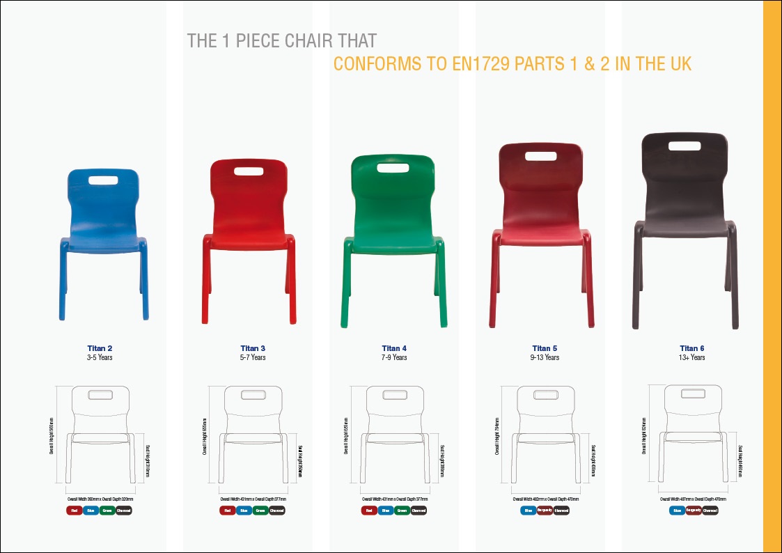 | Content | Titan Chair for Kids Seat: 360mm - 485mmW Part of the dynamic seating range, this lightweight, easy to clean chair is like no other. Ergonomic Design – To correct children’s posture & maintain a healthy sitting position. Classroom Safe – No sharp edges. And unique ‘S’ Shaped Back – To comply with EN1729 Part 1. Manufactured from ‘high impact’ polypropylene. Portable & Stackable – Up to 12 high when not in use. Superior Strength – To withstand the toughest of environments. Comes in 5 colours in 5 different heights for all ages kids from kindergarten to high school. Ideal for: - Classrooms - Libraries - Study groups - Open spaces - Collaborative learning