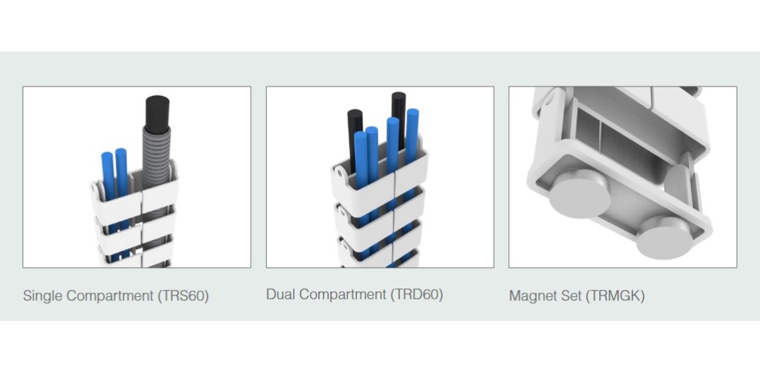 Trax umbilical cable management is specifically designed for cable protection when bringing power and data cables in a height-adjustable table application.