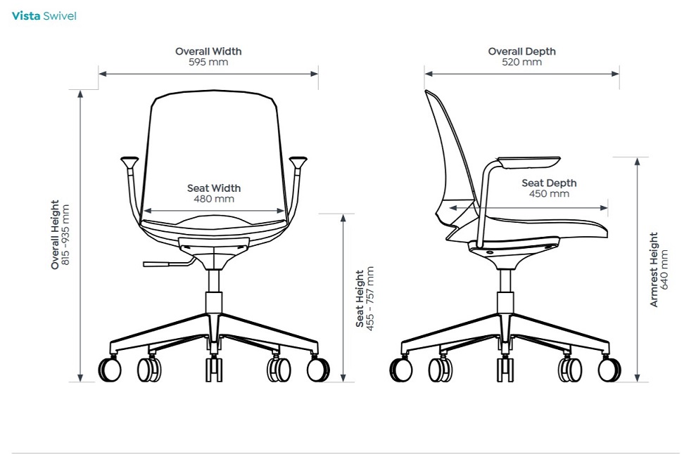 | Content | Vista Swivel Chair Seat: 480W x 450D x 445 - 757H Size: 595W x 520D x 815 - 935H