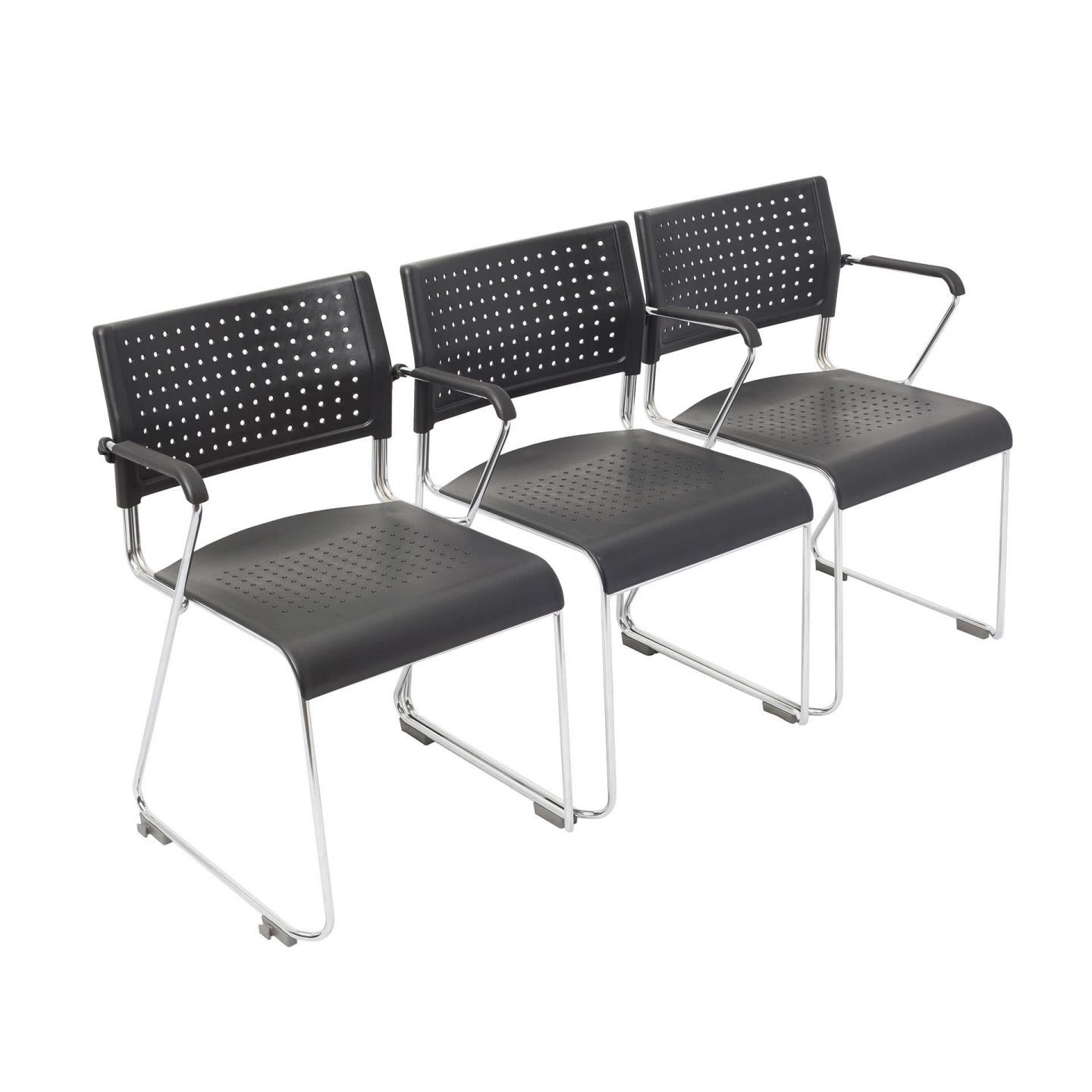 Very versatile chair with a black plastic perforated back waterfall seat and chrome steel rod sled base.