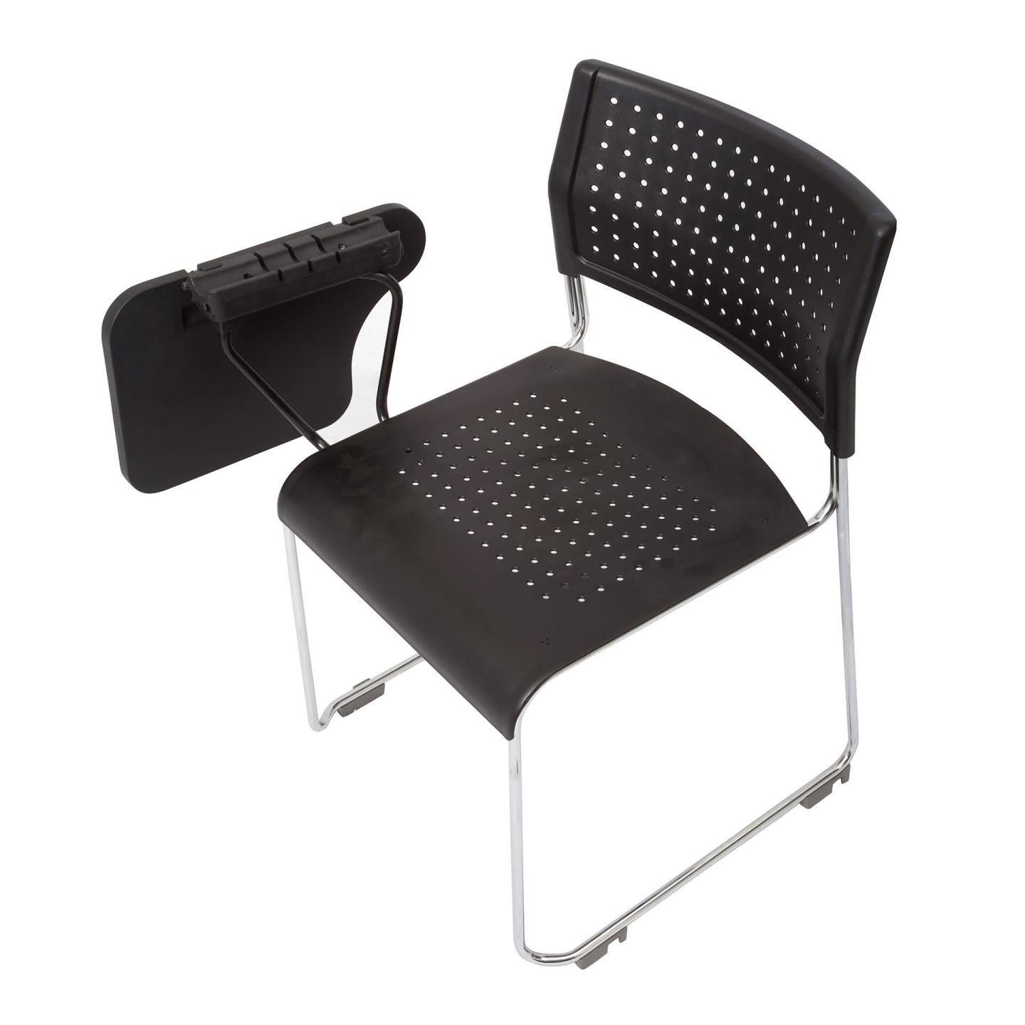 | Content | Wimbledon Tablet Chair for Students Seat: 425W x 430D x 440H Very versatile chair with a black plastic perforated back waterfall seat and chrome steel rod sled base. This quality chair is ideal for all companies, clinics, reception areas and training or conference rooms. This Budget chair is available with arms or with a tablet arm or with an optional seat and back fabric pad. This is a stackable and Linkable chair without arms. Or can be linked to every 3rd chair with arms (pic4).