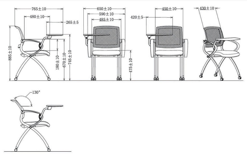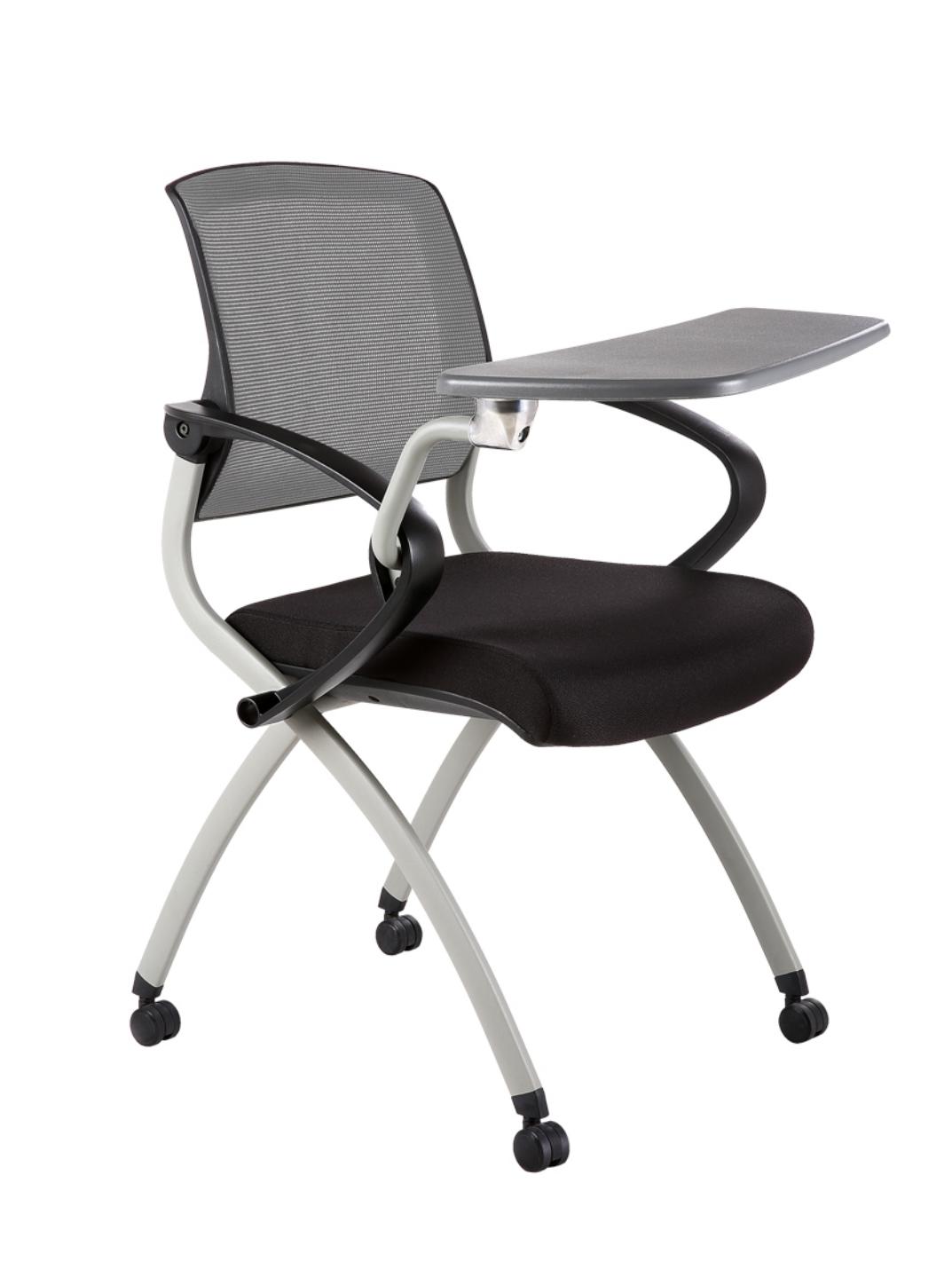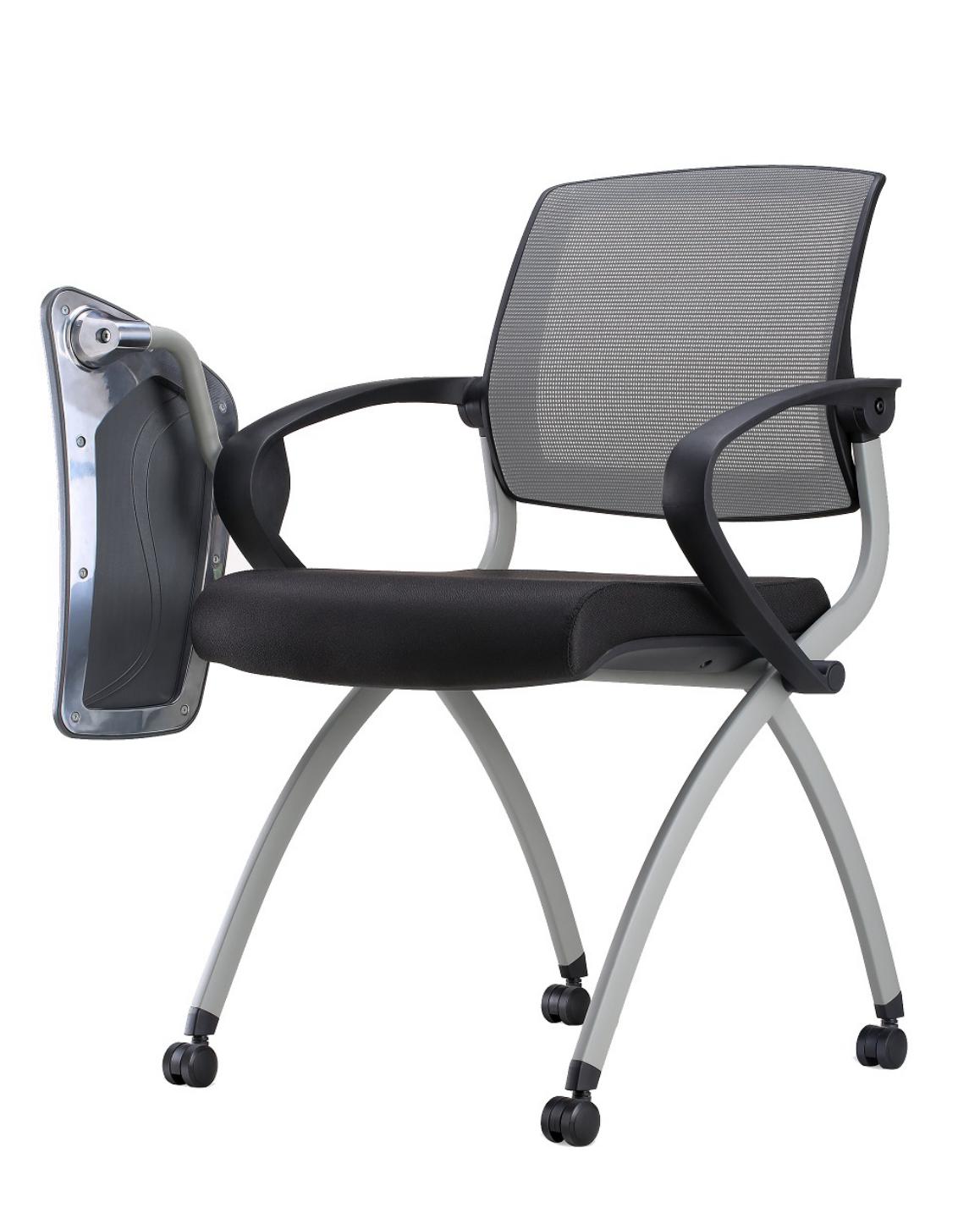 Has a foldable seat and an optional tablet. Lightweight and easy to store. Can be nest stored in a row after use.